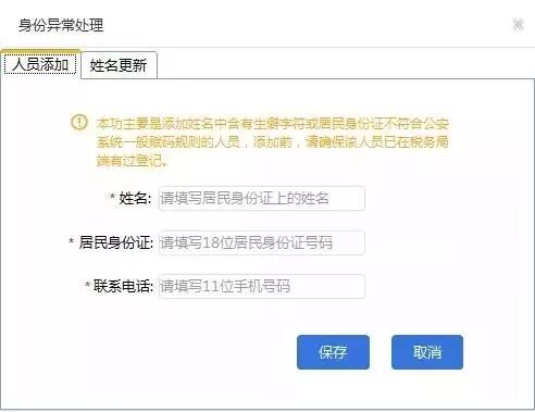 导入、导出模板调整 因为采集项目有调整,需要您下载最新的导入、导出模板使用。 身份异常处理功能调整 “异常身份证处理”按钮改为“身份异常处理”,进入后有“人员添加”和“姓名更新”两个Tab功能,如图: 人员信息采集 取消“更多操作”中“修改功能”,可通过双击人员信息记录进行修改; 由于人员状态修改时,要对应填写人员的任职或离职时间,故取消“更多操作”中批量修改“人员状态”功能。 在线咨询 去除小蚂蚁在线咨询功能,同步上线“个税在线咨询”浮窗,如图: