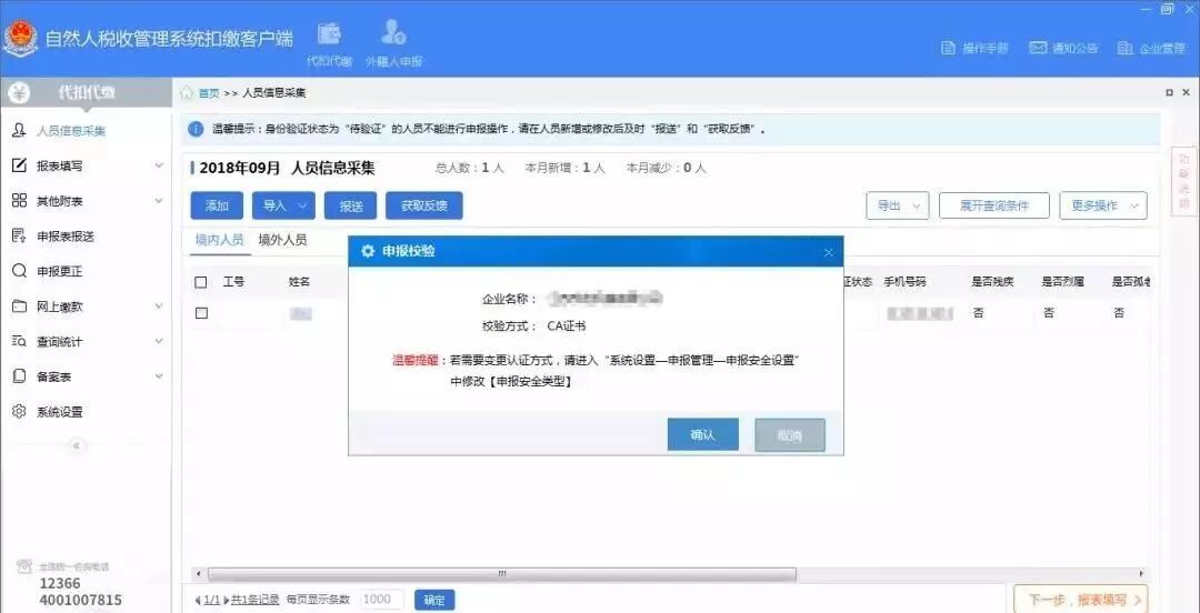 【10月自然人税收管理系统大升级,涉及11个变化点!请务必看完再申报!】税款所属期为10月的个人所得税,应当在11月申报!税月伴你行——专业的视角,及时的纳税指导,为您办税提供最有用的涉税信息。如果本文对您有所帮助,真心希望大家在文末顺便点赞,我们将为您提供更多更有价值的信息。 尊敬的纳税人您好: 2018年10月,《自然人税收管理系统扣缴客户端》需升级至3.0.020及以上版本,升级内容如下,请您查看完毕后再进行申报: 请确保网络稳定,软件登录会自动升级;若软件升级失败,可点击电脑桌面或任务栏右下角的“个税服务中心”-“点我咨询”进行咨询。 起征点调整 税款所属月份2018年10月开始适用新的减除费用、税率表,软件登录会给出此提示: 人员信息采集项目调整 新增/修改人员信息(状态为正常)时,任职受雇日期字段为必填项,离职(状态为非正常)时,离职日期字段为必填项,如图: 人员信息报送 人员信息报送增加加密校验,可使用CA或网厅密码,如图: 人员信息报送次数 人员信息报送增加次数控制,每个月可报送15次,且提示新增人员数量,如图: 人员信息采集规则优化